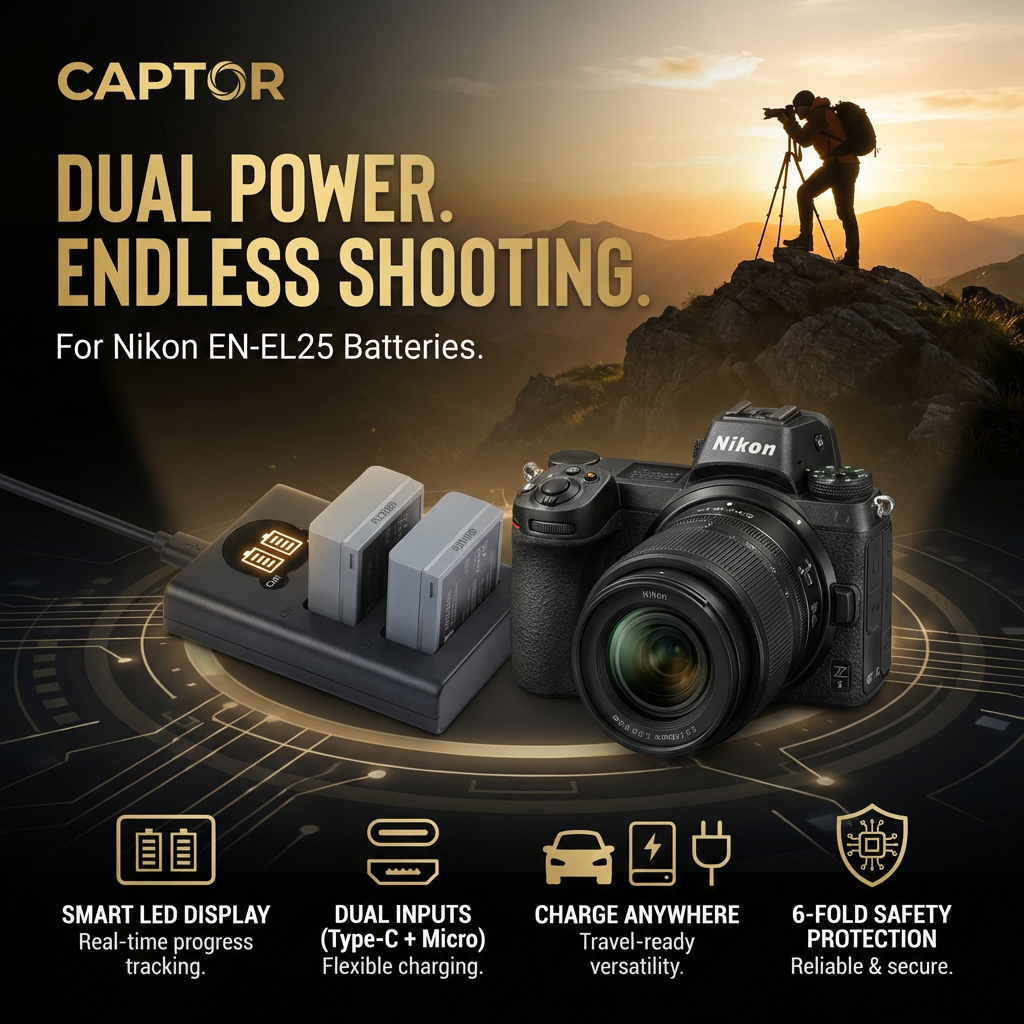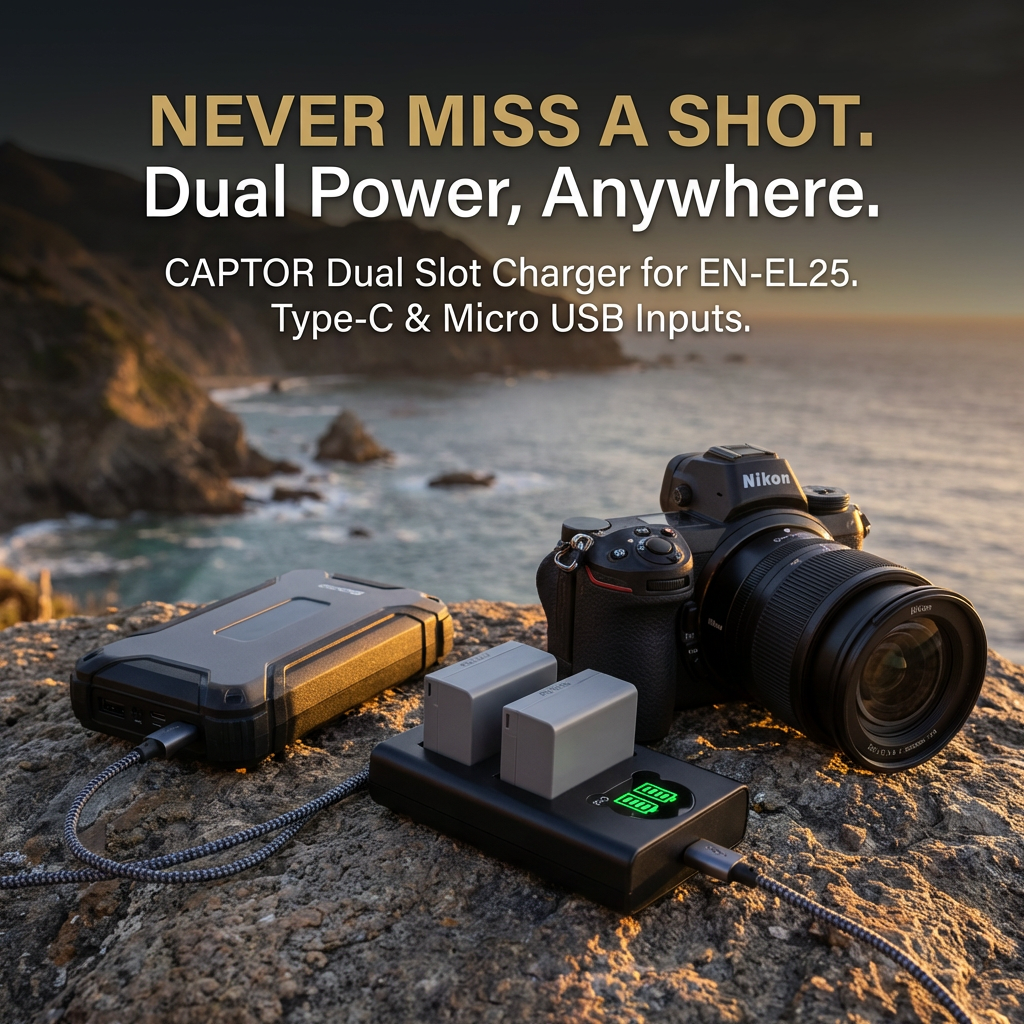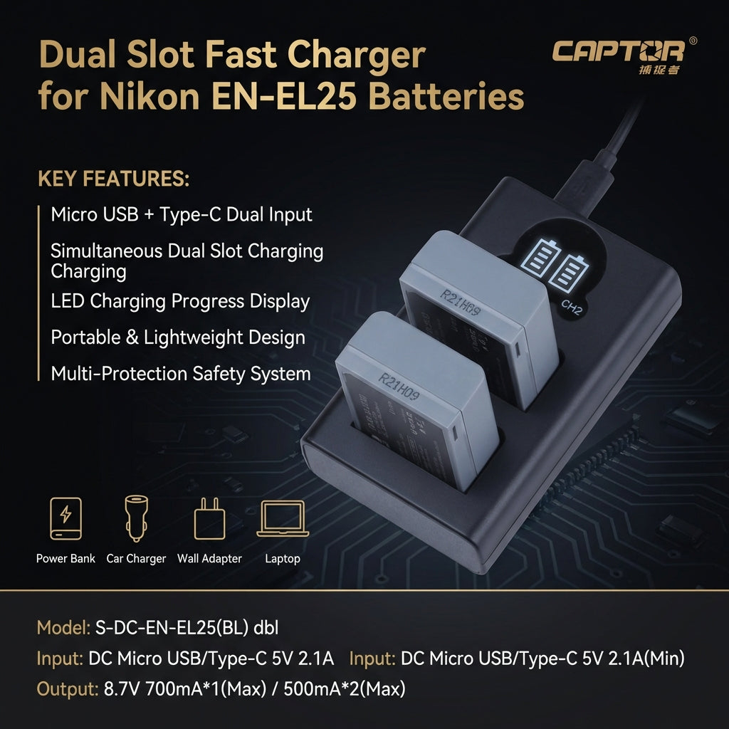 Product Overview: Never miss a shot with this Dual Slot USB Charger for Nikon EN-EL25. Designed for photographers on the go, it allows you to charge two batteries simultaneously, cutting your waiting time in half. The charger features versatile dual inputs (Type-C and Micro USB), making it compatible with power banks, car chargers, and laptops—perfect for travel and outdoor shoots.