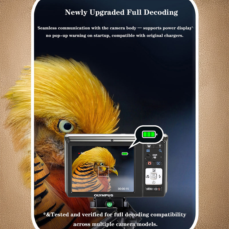 The upgraded full-decoding system communicates seamlessly with your camera—supporting accurate power display and eliminating error pop-ups. Tested across multiple camera models, it offers smooth startup, stable operation, and full compatibility with original chargers. This ensures worry-free use whether you’re shooting photos or recording high-frame video content.
