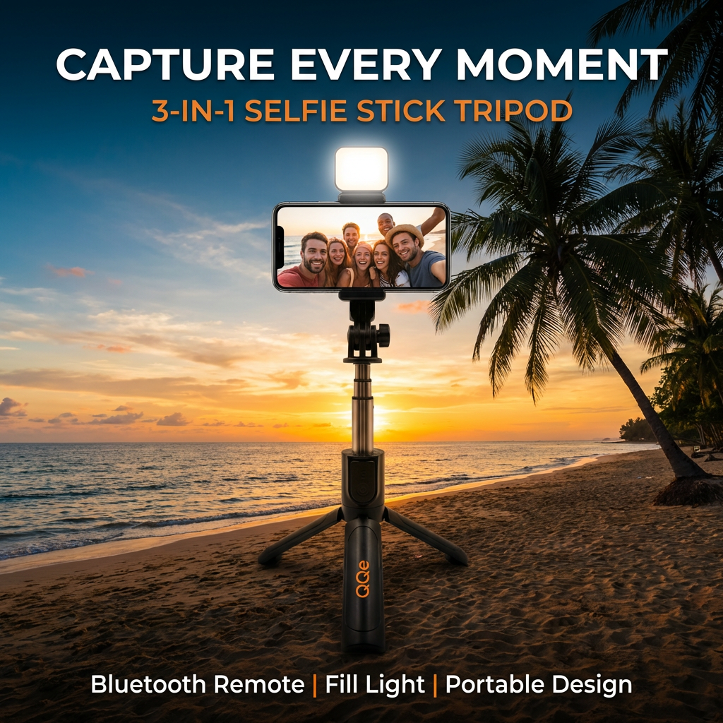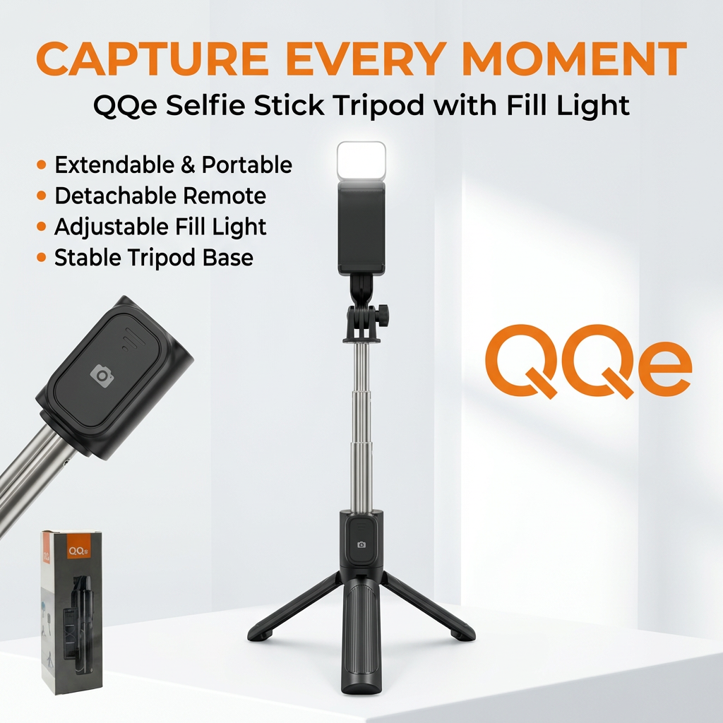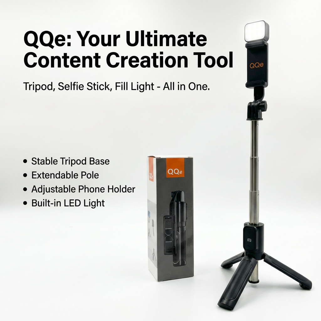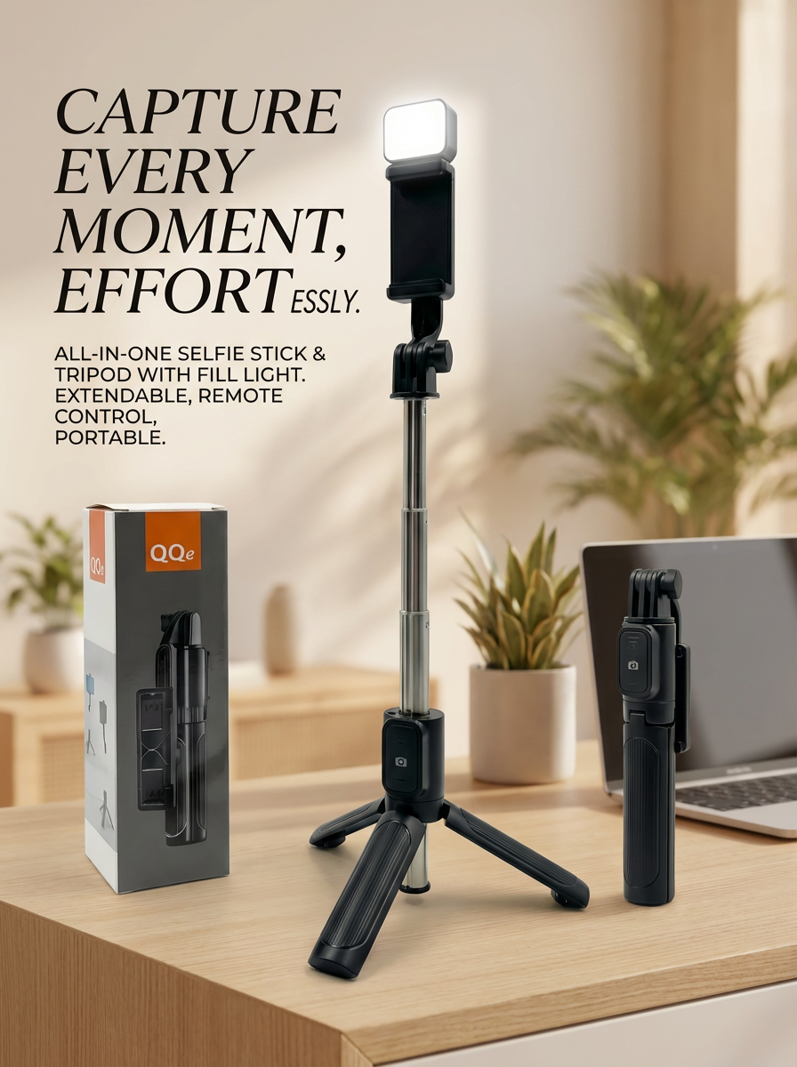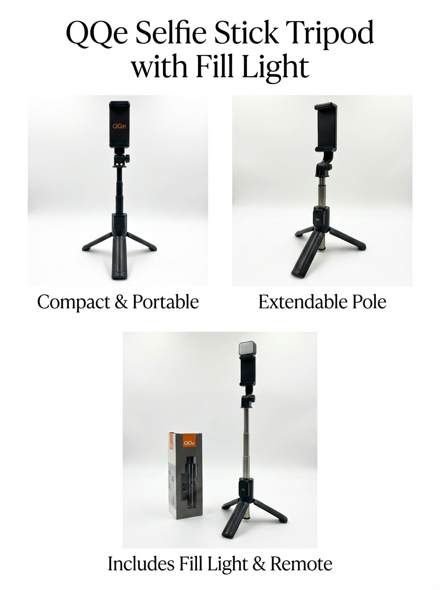 Light Up Your Beauty, Anywhere. The QQe Selfie Stick Tripod is designed for creators who refuse to let bad lighting ruin a perfect shot. With a built-in LED fill light, this 3-in-1 tool ensures you look bright and radiant in selfies, vlogs, and live streams, even in dark environments.
